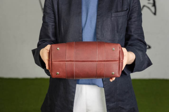 時には、地面に直置きすることもあるバッグ。いくら雑に扱っていいと言われても、やはり地面に直接置くのは気になりますよね。その点、「育てる本革バッグ」は底面に鋲がついているので安心。細かい部分にこだわりました。
