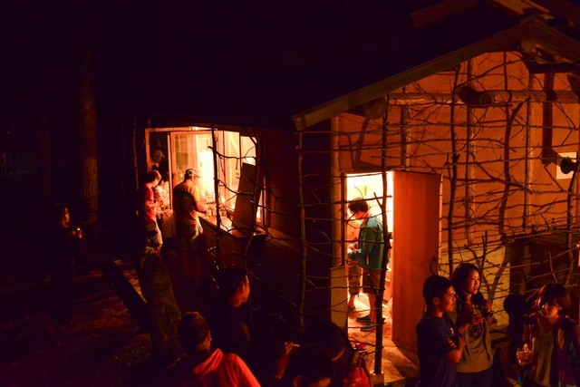 プレイドームは、貸し切り中、自由に使える体育館。大人の運動会を楽しむもよし、お子様と一緒に遊ぶも良し、DJブースを設置して仲間と一緒に騒ぐも良し。カラマツの木で覆った小屋の中には、ビールサーバーと薪ストーブ。人が集まる拠点として、昼はカフェ、夜はバーとして存分にお使いください。