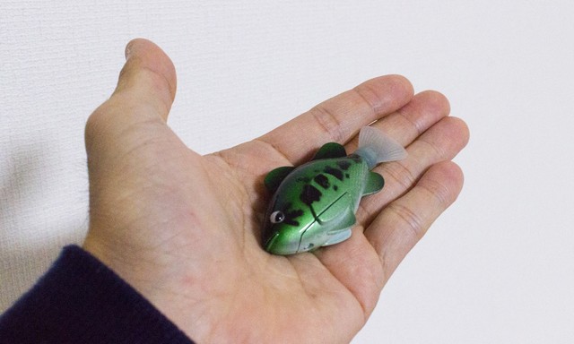 このロボフィッシュ、意外と大きく手のひらに乗せるとこんな感じです。ルアーサイズとしてもちょうど良く、さらにカスタムしてフックをつけてルアーとして実際に使ってみると面白そうです。