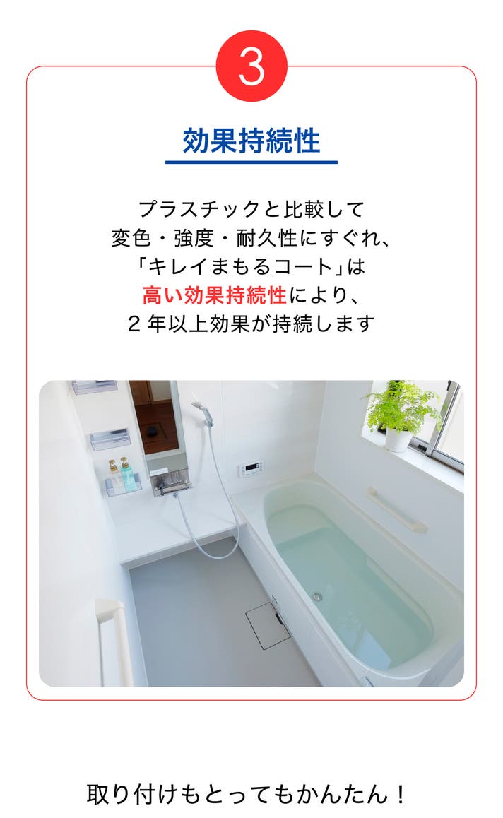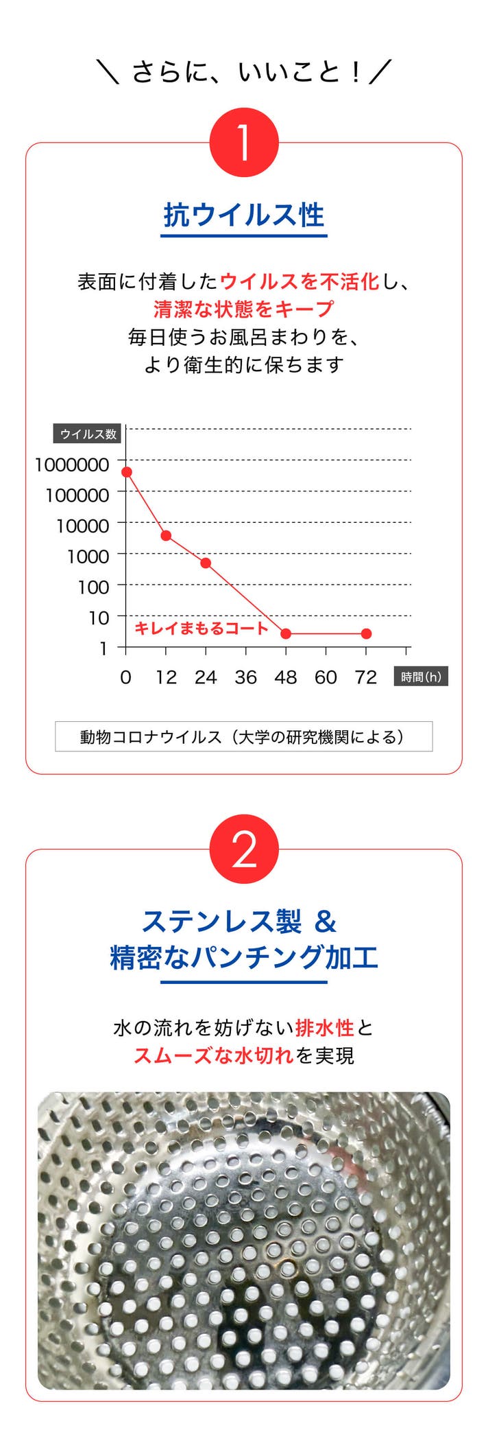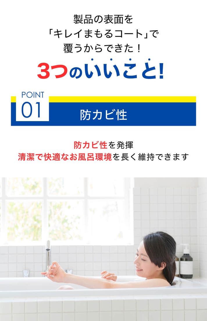 - 長く続く清潔さ → ”キレイまもるコート”が「ヌメリ」や「カビ」を抑え、清潔を長期間キープ