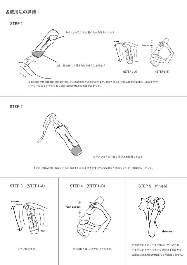 使用方法は簡単でシャンプー剤を1〜2プッシュ、適量のお湯(35ml、50ml、100ml)を入れて開口部を手の平で握って振るだけです。