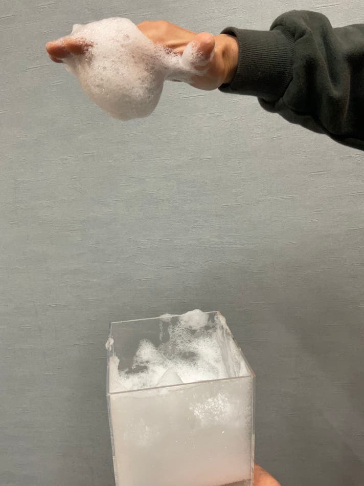 作られた泡は泡膜面積も大きく弾力性のある泡は手を逆さにしても落ちないほど密着したもっちり泡になります。
