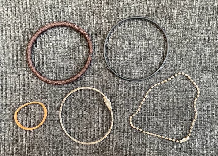 A.底部の穴の直径は5mmになります。紐、シリコーンゴム、ヘアゴム、キーリング(ステンレス)など錆びにくい素材がおすすめです。