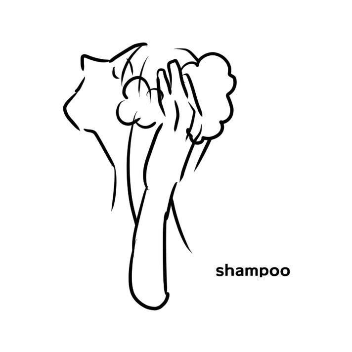下記のイラスト(例)は、はじめのシャワー(すすぎ)を省いた”節水パターン”&”プレシャンプー”の使用方法(シャンプー剤使用量:3ml)です。