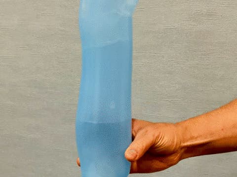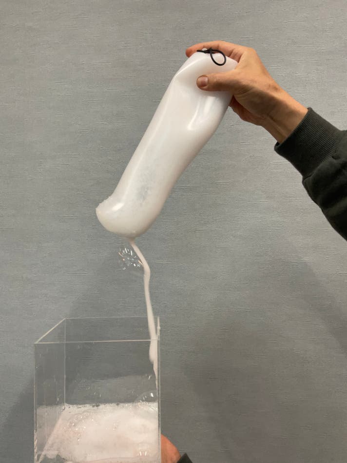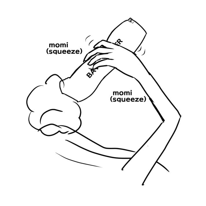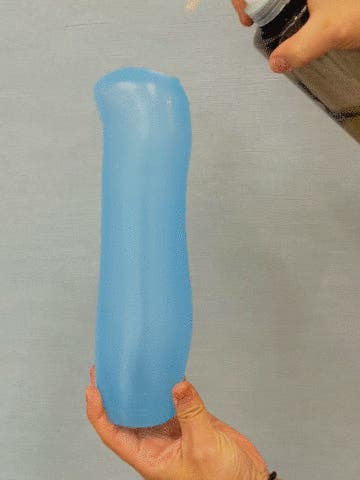 内部に発生した泡を逆さに向け頭に排出する際に胴体部分のどこの部分でも”掴み&揉める”ことで泡を押し出すことが出来、内容物をスムーズに排出できます。