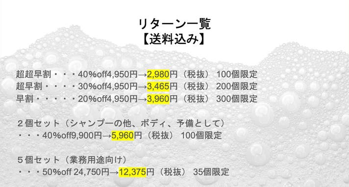 2個セット(シャンプーの他、ボディソープ用または予備)・・・・40%off 9,900円→5,960(税抜) 100個限定