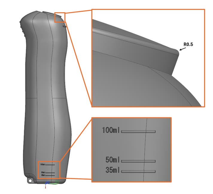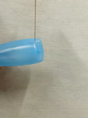 片付け方法:350mlの目盛り近くまで水(お湯)を入れ軽く振り混ぜ、逆さに向けるだけで残留液を排出した後、フックに吊るす。