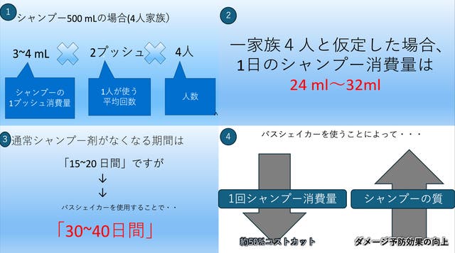 500mlのシャンプーボトルを購入した場合、シャンプー剤は「15〜20日間」で無くなってしまいますが、バスシェイカーを使用することによって泡質の向上と泡量が約2倍に増えることからいつものシャンプー剤量の半分で済ませることが可能です。