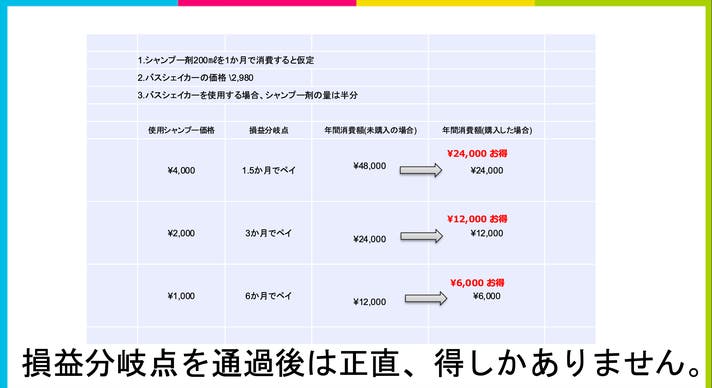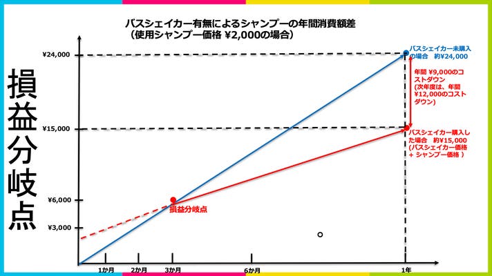 下記は『バスシェイカーを購入した場合の損益分岐点』を示したものになります(表示が小さい為、ピンチ拡大をお願い致します)。