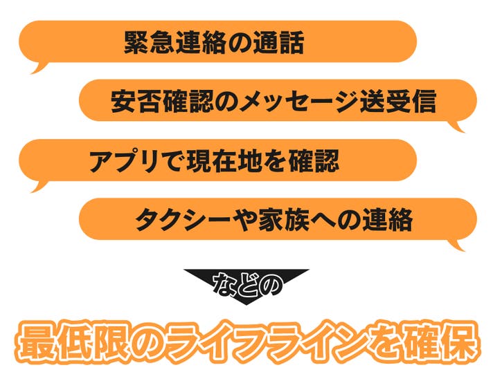 「緊急連絡の通話」「安否確認のメッセージ送受信」「アプリで現在地を確認」「タクシーや家族への連絡」などの最低限のライフラインを確保できます。