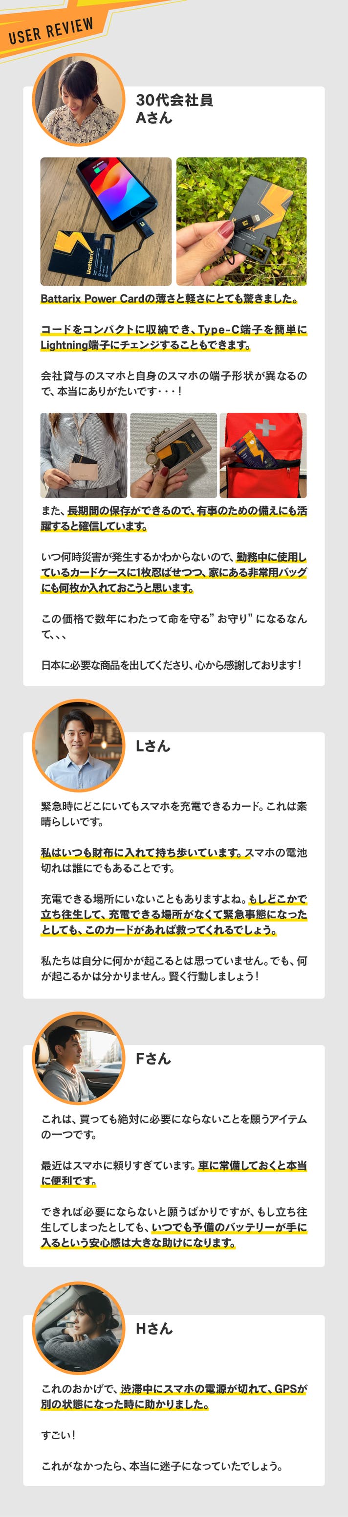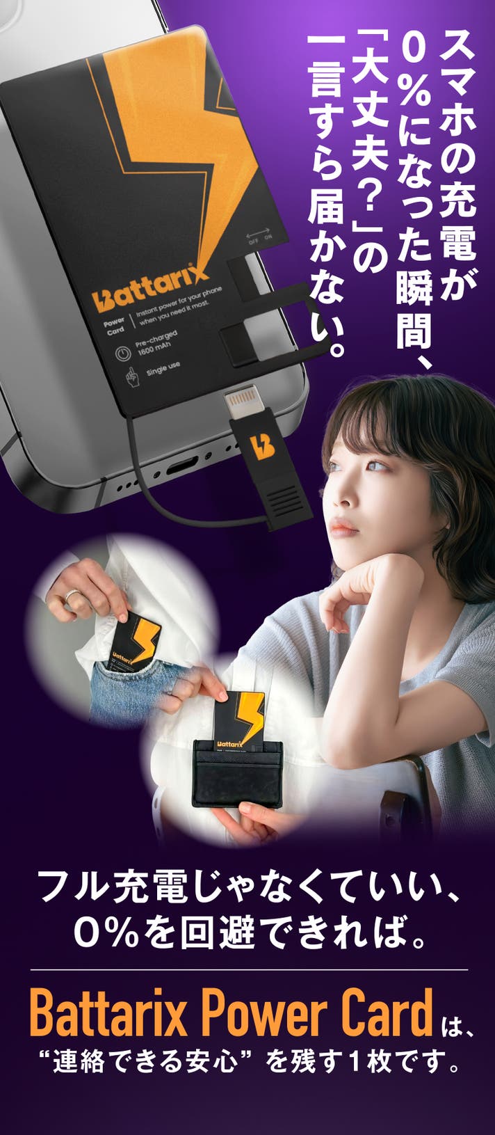 スマホの電源が切れて連絡が取れず不安になる方、災害時に家族と連絡が取れない不安を抱える方を多く見てきた経験から、「Battarix Power Card」に強く共感しました。