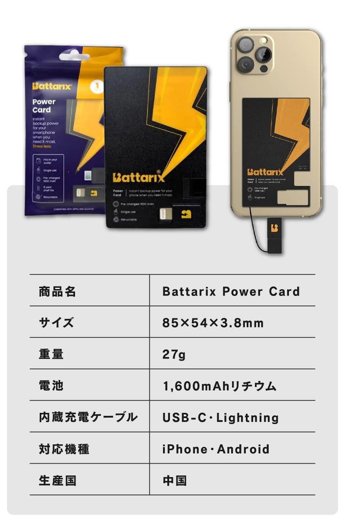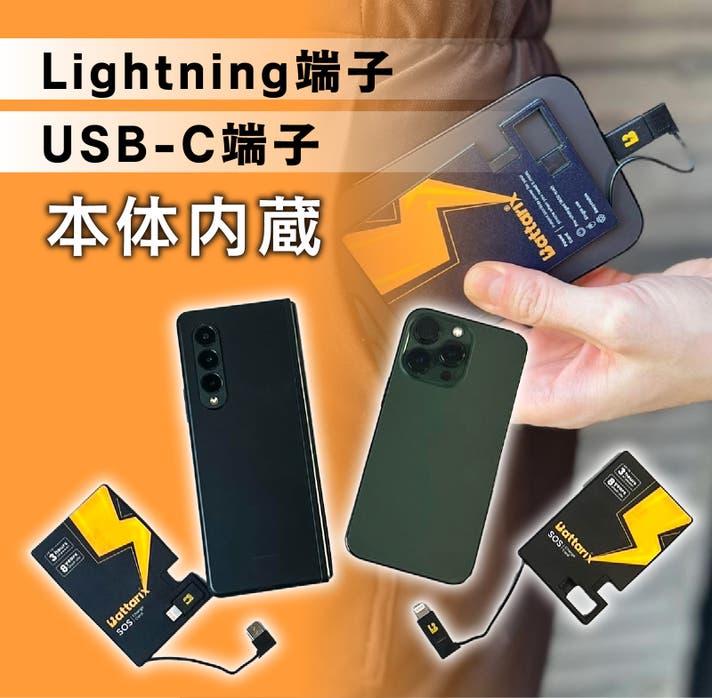 【Battarix Power Card】はUSB-C端子とLightning端子を本体に内蔵。