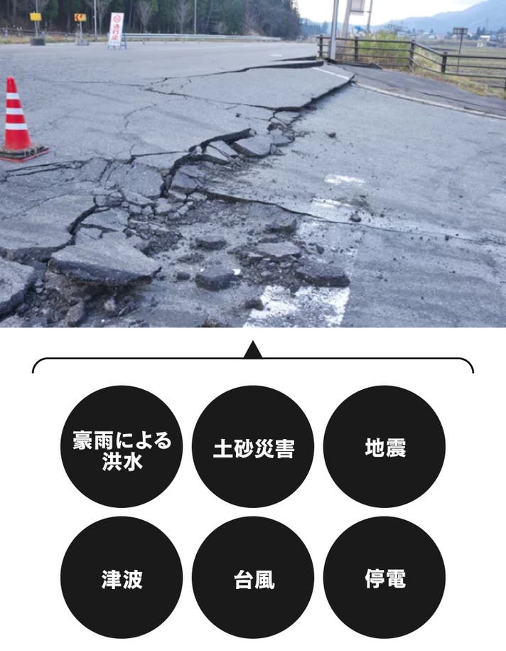 豪雨による洪水や土砂災害、地震、津波、台風、停電、、