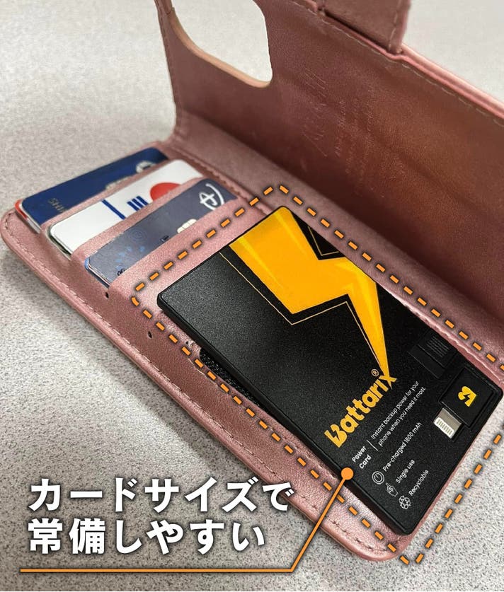 「Battarix Power Card」は、軽くてカードサイズ、定期入れや財布、ポケットに入れておけるから、持ち運びの負担がありません。