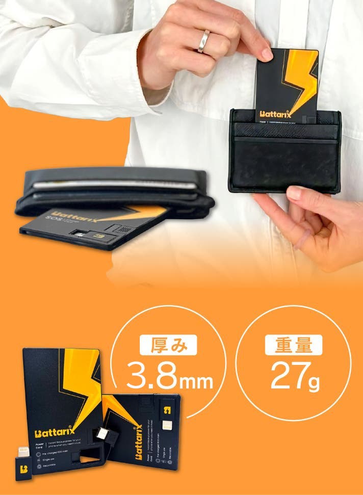 【Battarix Power Card】のサイズは、名刺やクレジットカードとほぼ同じで厚さは3.8mm、重さはたったの27g。