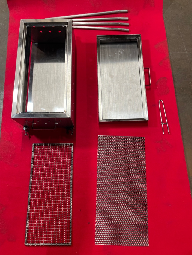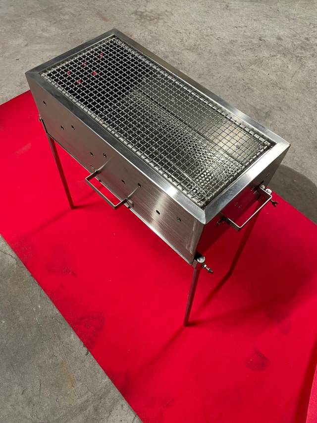 本プロジェクトを実施にあたり、軽量・コンパクト・耐久性を念頭に開発してきましたが、板厚が薄い、蝶番でコンパクトにすると熱による変形の恐れが有り、コンパクトより耐久性を重視して作りました。四隅・底面を全溶接して熱よる歪みを抑えました。また、溶接面を綺麗に仕上げ溶接面を曲げた板を曲げたように仕上げました。(厨房フード製作技術を活かして仕上げました) 幅500mm×奥行250mm×高さ180mmで、5人~10人のパーティーでも対応出来ます。 焼き網は2~3回使うと錆びてボロボロになるようなことは有りません。網枠にステンレスのΦ9丸棒を使い、網はステンレスt1.6mm・4メッシュを使用してます。網に付いた油はバーナーで焼き落とせます。 一つ一つ手作りで製作してるので、生産が追い付かない事のないように製作します。 万が一発送が遅れる場合は、サポーター様に報告いたします。 予期せぬアクシデントが発生した時は、速やかにサポーター様に報告いたします。 仕様・デザイン等の変更が生じた場合には、適宜活動レポート等でお知らせします。 予想を上回る応援購入が有った場合は、お届け日がやむを得ず遅れる場合があります。 予期せぬアクシデントが発生した場合には、速やかにサポーター様に報告いたします。 原則として、発送延滞に伴う応援購入のキャンセルは出来ませんが、リターン配送予定月から2か月を超えた場合は、希望者に限りキャンセルにて対応させて頂きます。