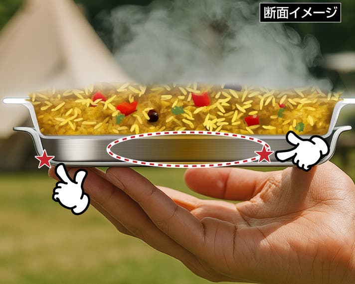 「熱くなりにくく冷めにくい」構造で、料理がず~っと暖かいまま、手で持って楽しめます。