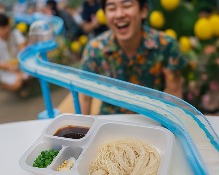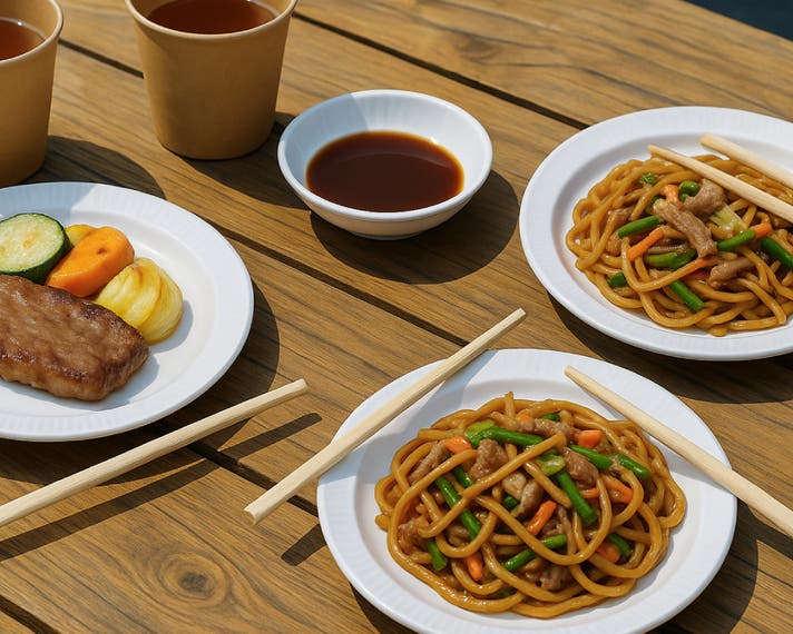 紙皿が風で飛ばされて料理やタレがテーブル上に散乱…。