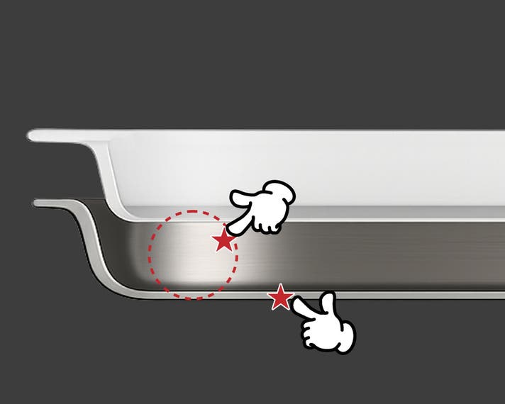 Bトレーの外容器は、熱くなりにくくて冷めにくいSUS304ステンレス製。さらに、内容器の交換式PPトレーには、外容器の間に空気の層を発生させる極小突起を設けました。この空気層により、熱伝導率をさらに抑制することに成功。より熱くなりにくく冷めにくい構造になりました。