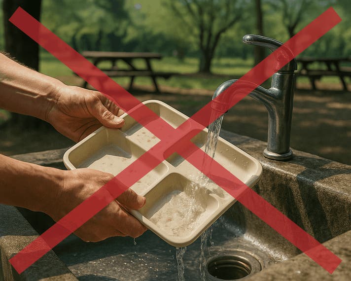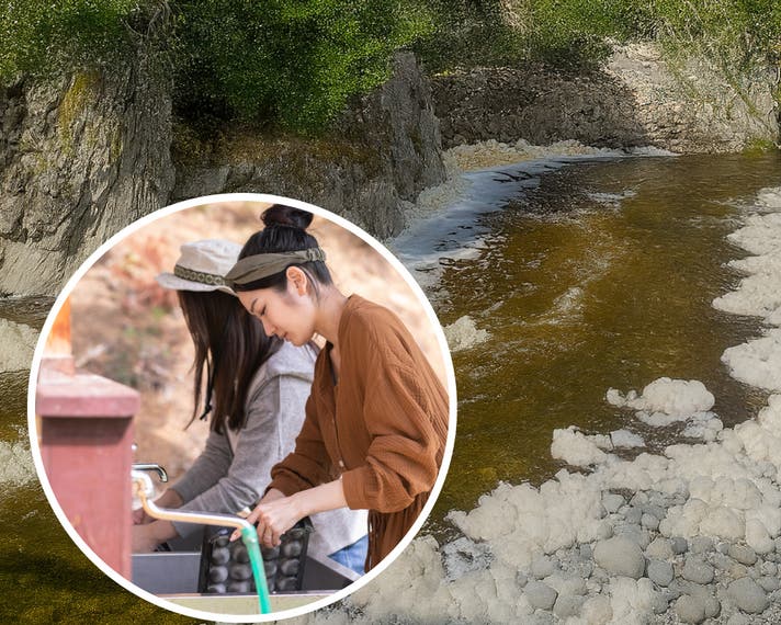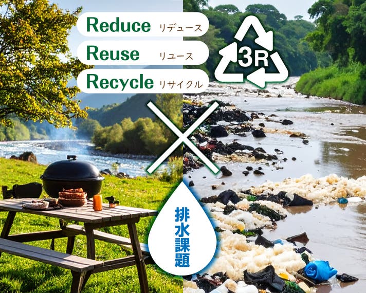 BBQ後に食器を洗うため川辺で台所用洗剤を使うと、本来は適切に下水処理されるべき台所由来負荷が、未処理のまま河川へ直送されます。