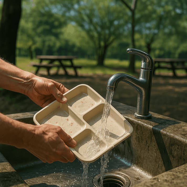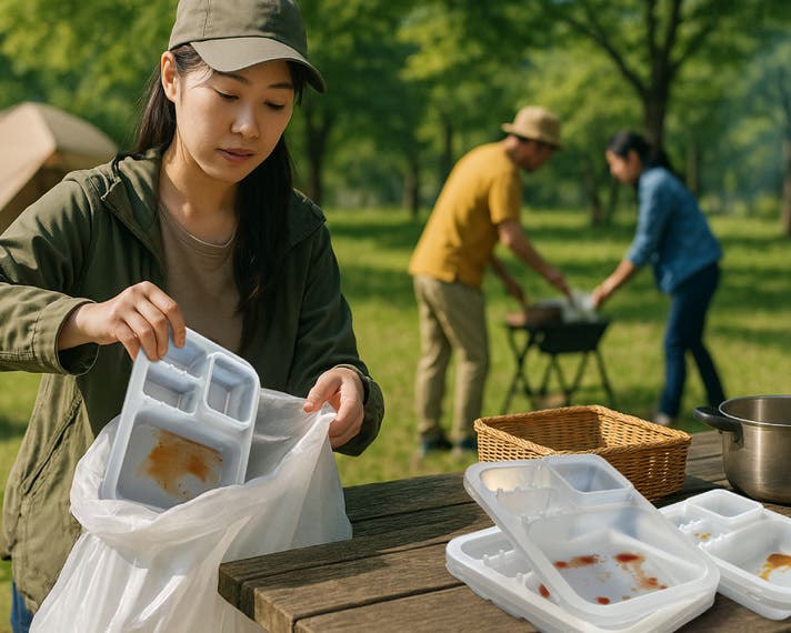 「Bトレー」なら、BBQを楽しんだ後、現地で洗剤を使用する必要はありません。交換式PPトレー(内容器)をそのまま回収し、自宅に持ち帰ってサッと水洗い、その後は資源ごみとしてリサイクルに回せます。