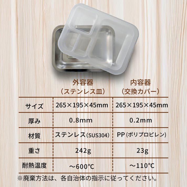 - ステンレス製の皿+皿とPPトレーの間の空気層で熱伝導率を低減=熱い料理も持ちやすい&冷めにくい
