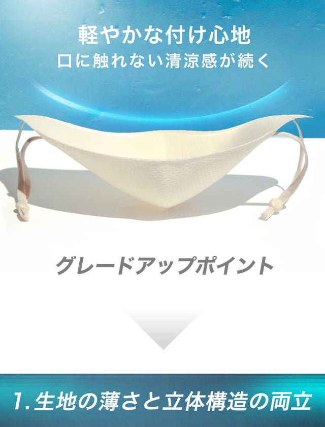 多くのサポーター様から頂いた好評とご意見をもとに大空間をキープしつつ極限まで軽やかな付け心地にこだわった持続ひんやりマスクがついに誕生!