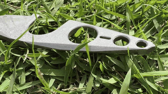 刃と柄が一体となった、67層ダマスカス鋼の文様。