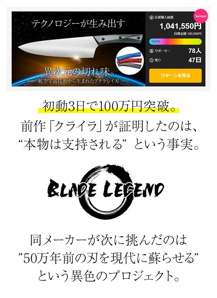 リターン品の配送が完了するまで、番場デザイン制作所はBlade Legendの日本における独占販売権を有する正規代理店です。詳細に関しては、ページ下部のリスク&チャレンジをご確認ください。