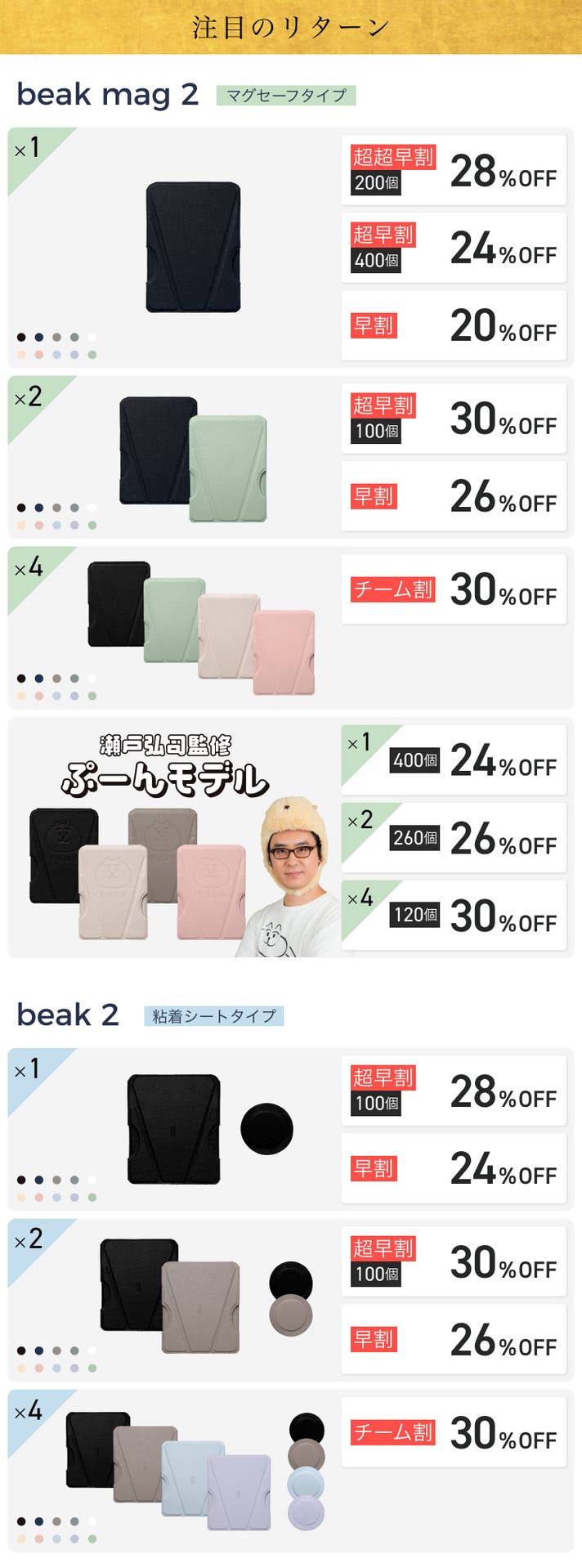 「Makuake(マクアケ)」は、実行者の想いを応援購入によって実現するアタラシイものやサービスのプラットフォームです。このページは、 プロダクトカテゴリの 「薄型強化版!3in1スマホグリップスタンド:beak 2, beak mag 2」プロジェクト詳細ページです。