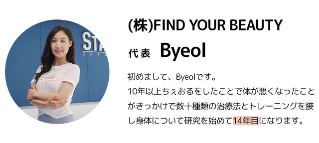 長い年月をかけて体を治し、健康と美しさを長く維持させるために “1人で自己管理をできるようにする” というモットーを基準に FIND YOUR BEAUTY センターで 10,000名以上の受講生にトレーニング方法を教え たくさんの成果の声を頂いています。そしてこれらを基に忙しい現代社会を生きる 方々のために現実的で効率的なセルフケア法を研究した結果、家でできるピラティスと ウェイトトレーニングを開発しました。