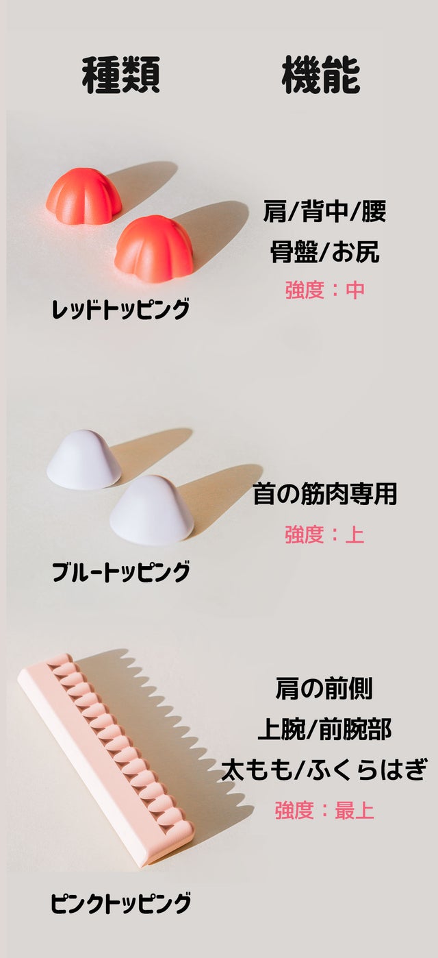 トッピングを替えるだけで様々な部位を圧迫できる。