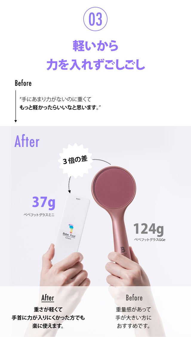 お肌のコンディションが毎日違うように、足の角質もその時々で違います。ハード+ソフトパターンのベベフットグラスミニで足の角質を丁寧にケアしてください。