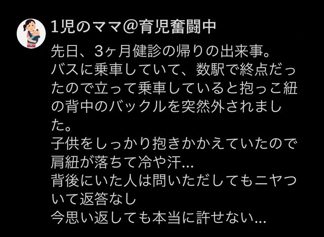 抱っこ紐を外された経験があると言う投稿がたびたびネットに上がり、