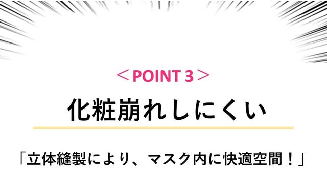 - 立体縫製のため、マスク内に空間ができ、化粧崩れしにくい。