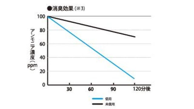 A:本製品の消臭・吸湿には速効性があります。第三者機関の一般社団法人ニッセンケン品質評価センターでの試験の結果、120分後にはアンモニアは92%、イソ吉草酸は99%以上消臭されていることが証明されております。