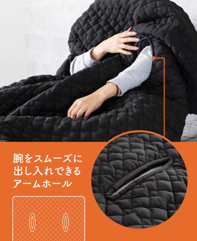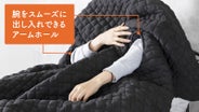 腕を出し入れできるアームホールが付いているので、SNSのチェックや動画視聴、ゲームなどのスマホ操作が、布団を首元まで掛けた状態で暖かく快適に。