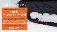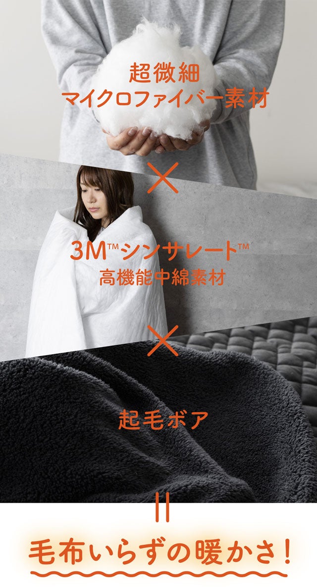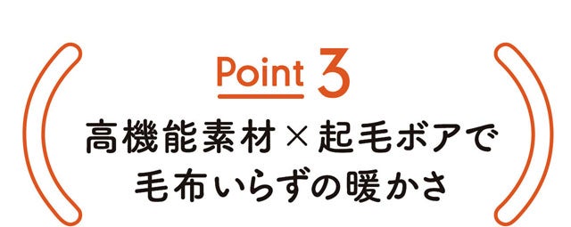 保温・断熱機能に優れた高機能素材の相乗効果と、暖まった空気をたっぷり含んでキャッチする起毛ボアのトリプル効果で毛布いらずの暖かさに。