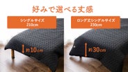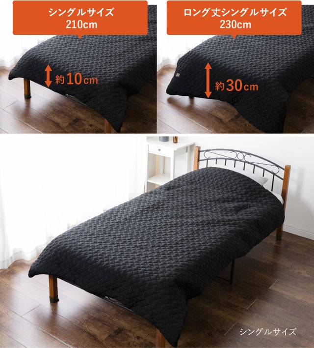 通常のシングルサイズ/210cmと、ロング丈シングルサイズ/230cmの2種類をご用意しました。ロング丈は、ベッドに座った状態でご使用いただく場合や長身の方でも足先が出にくい設計。身長やお好みによってお選びいただけます。