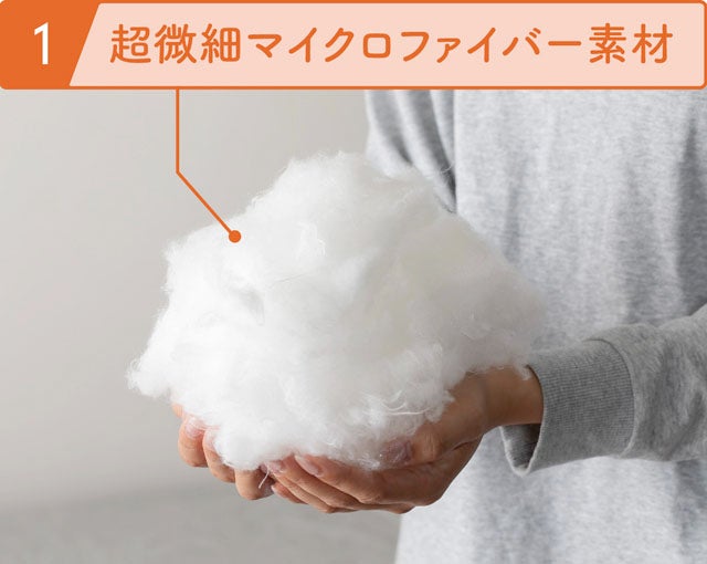 毛髪の約1/50という超極細繊維が布団内部に暖かい空気を溜め込むことで、高い保温性を発揮。また、天然羽毛のふんわりとした柔らかさと軽さは、細い繊維と太い繊維が高密度に混在することによるもの。このことに着目し、太さの異なるマイクロファイバーを配合する独自の技術で再現しています。