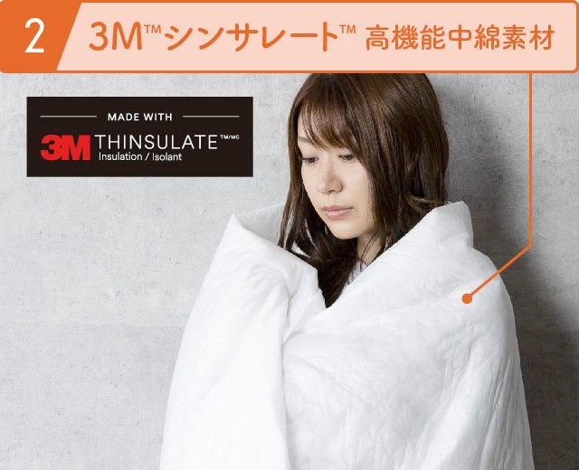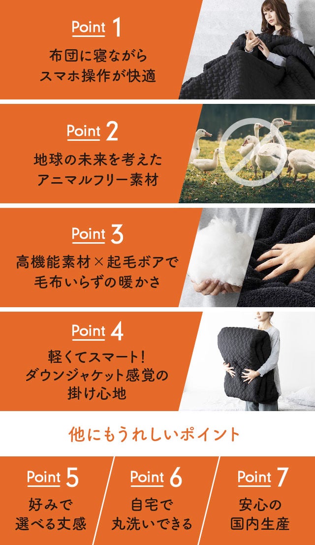 高機能素材や起毛ボアにより暖められた空気をたっぷり含んだ布団は、薄手でも暖か。まるでダウンジャケットを羽織っているような感覚です。重い布団が苦手な方にもオススメ。