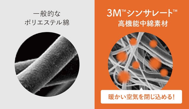 複雑に絡み合う繊維構造が、3M™シンサレート™(高機能中綿素材)の特徴。その繊維の間に大量の暖かい空気を閉じ込め、逃がしません。