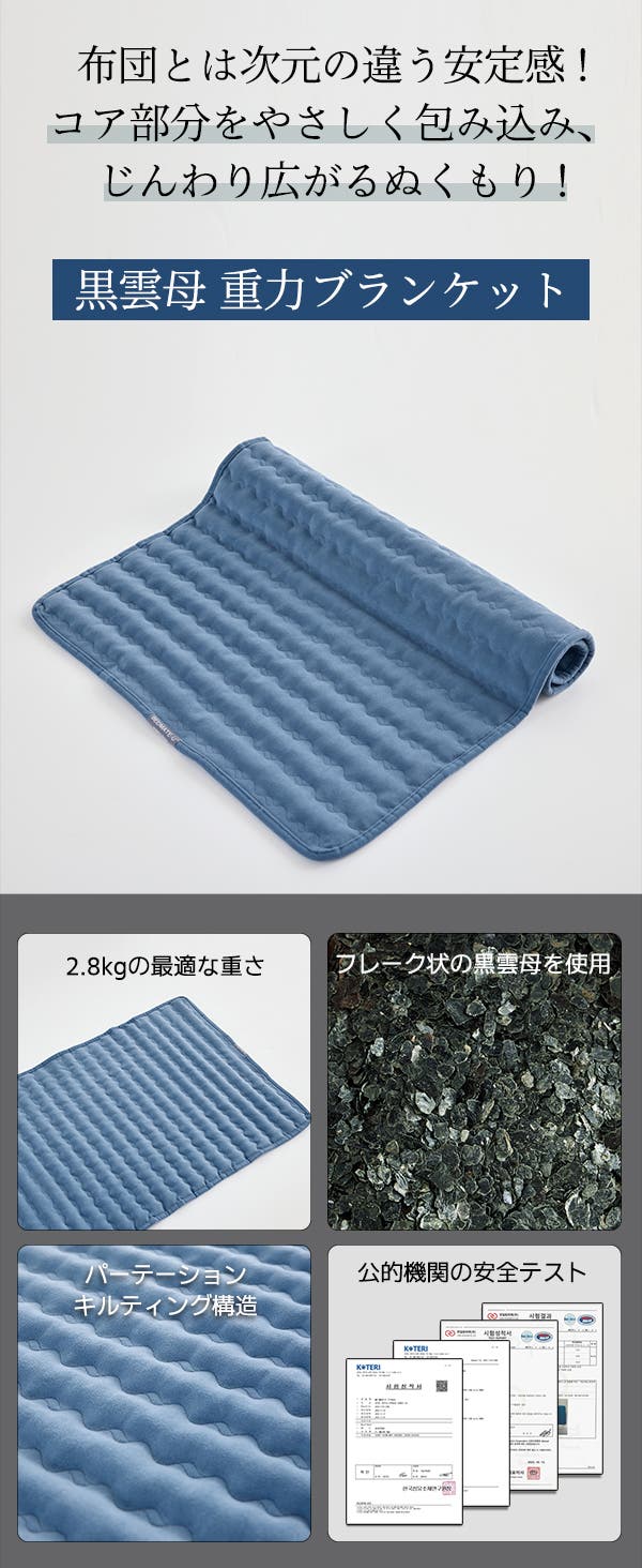 この3つにこだわり完成した黒雲母重力ブランケットは、無理に眠りにつかせるのではなく、眠る前に体が自然と心地よくほどけていく時間にしてくれます。