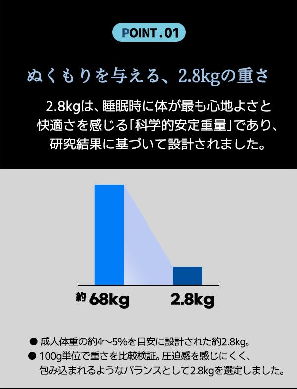 - 腹部のコアだけをじんわり包み込む2.8kgの掛け布団で、自然に快適な眠りへと誘います。