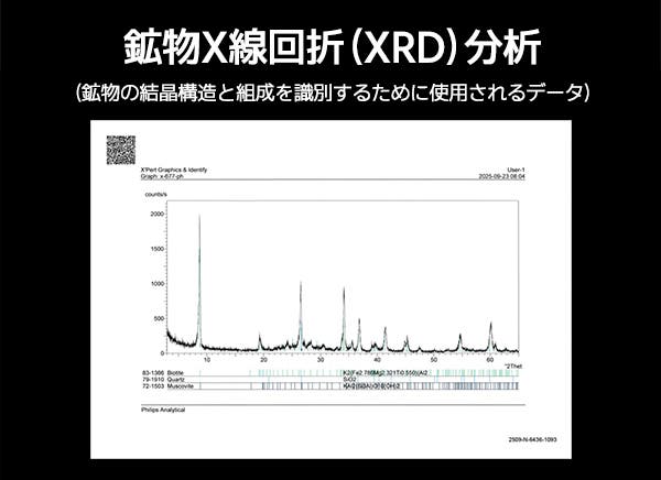 グラフのピーク位置と相対強度は、標準的な結晶学データベース(ICDDカード)のパターンと一致しており、各鉱物の存在が確認できます。