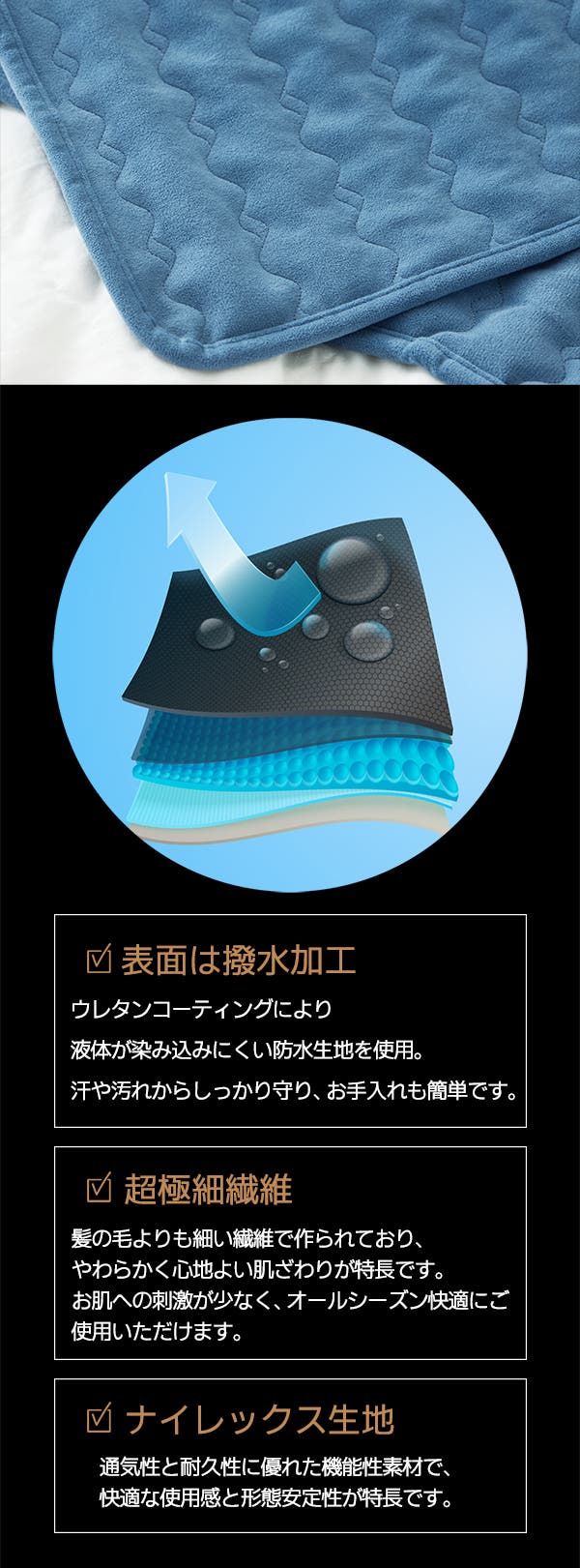 ちょっとした汚れや水気をしっかり防ぐ日常生活用防水生地を使用しています。やわらかなファブリックの肌触りはそのままに、防水機能だけをプラス。お肌への刺激が少なく、快適にお使いいただけます。