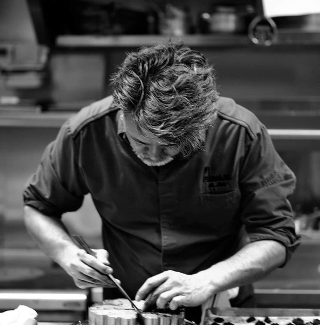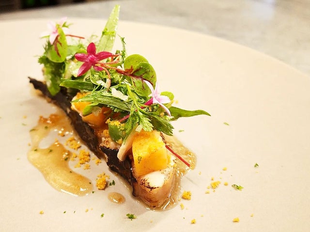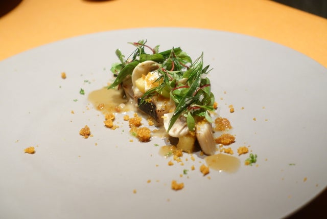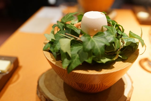 BEE&YOUエナジーはちみつ(プロポリスとローヤルゼリー入り)とシェリーヴィネガーのヴィネグレットソースをナッペして2年熟成の自家製カラスミをアクセントにたっぷり削りかけ。最後に石井シェフ従兄弟の柚子専門店『柚子柚子商店』から仕入れた青柚子を香らせ完成です!