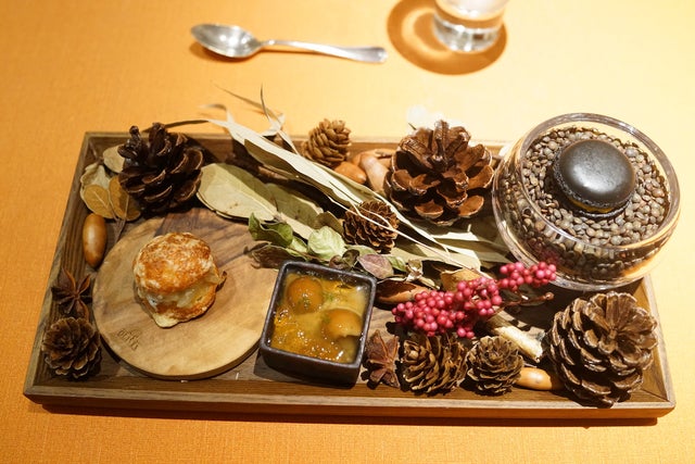 卵の殻の中は、シェリー酒酢の泡とトロトロでコクのあるスクランブルエッグに、熱々カリカリのベーコン!甘すぎないパインローハニー(松の木のハチミツ)が卵の旨味を引き立ててくれます!
