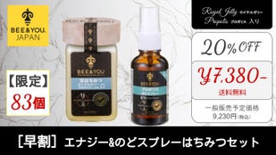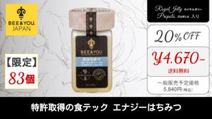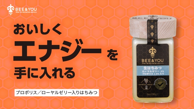 欧米各国で絶大な人気を誇っている「エナジーはちみつ」。ミツバチ製品を展開する、大人気ブランド『BEE&YOU』。エナジーはちみつ ロイヤルゼリー 3% プロポリス 1.5% 入りの日本発売に伴う、先行販売。独占輸入者・国内総輸入元の(BEE&YOU JAPAN/株式会社プラスプ)が実施します。