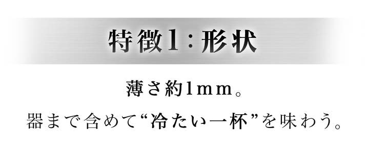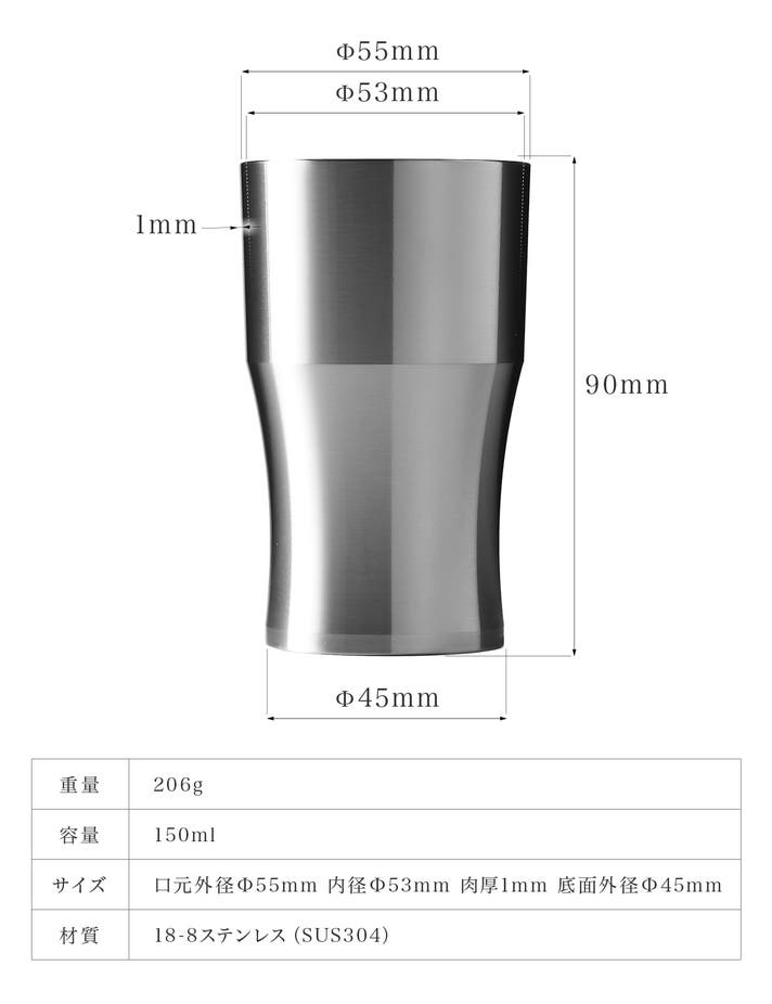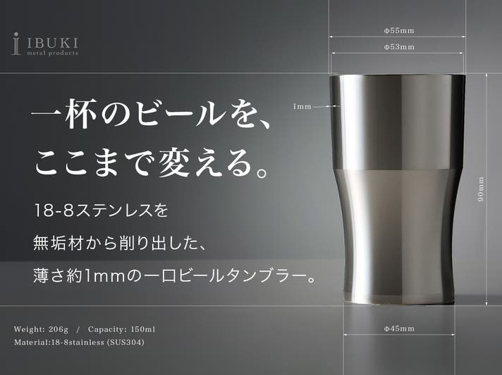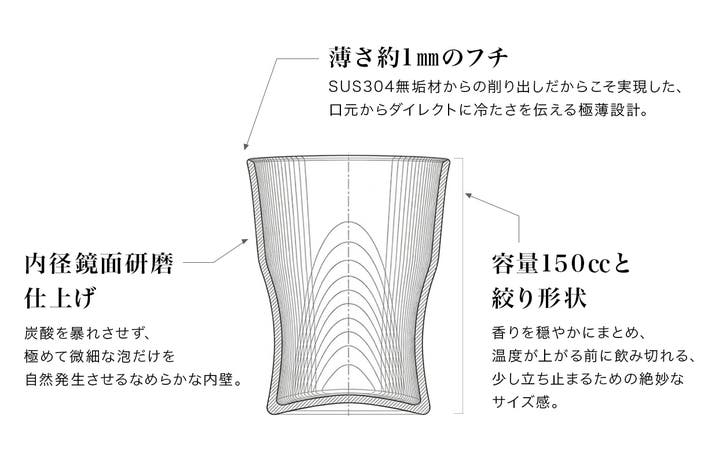 SUS304削り出しならではの薄さ約1mm、鏡面研磨の内面、150ccという容量設計により、冷たさ・泡・口当たり・味わいの印象までこだわって仕上げています。